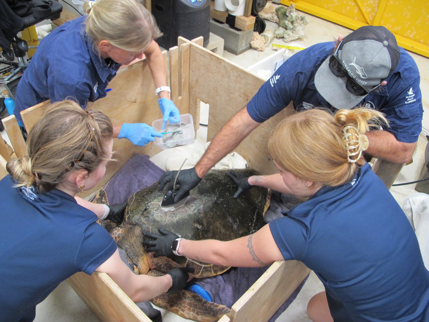 DBCA Exmouth District and Ningaloo Discovery Centre and Aquarium team worked together to attach a satellite tag to Lolli, which will deliver valuable insight and data to learn more about the endangered species.
